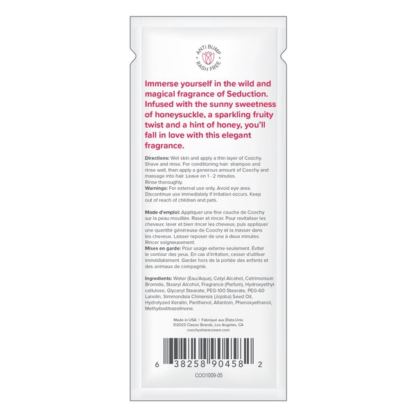 Immerse yourself in the wild and magical fragrance of Seduction. Infused with the sunny sweetness of honeysuckle, a sparkling fruity twist and a hint of honey, you'll fall in love with this elegant fragrance. Our signature shave cream stops red bumps from appearing on your bikini area, underarms, legs, and anywhere else you shave. Leaves skin oh so smooth and irresistible to touch!