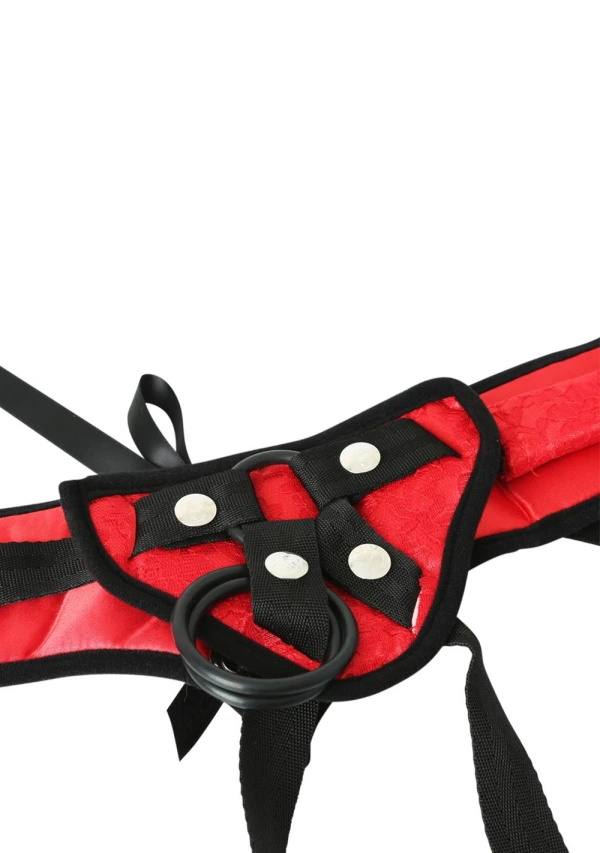 Red lipstick, red lace. Light up the night and your lover’s face! The glow of scarlet lights up the room and the mood is instantly set. No one can argue with the seductive power of red when you don this sexy Lace Corsette Strap-On. The bedroom is your stage and you’ll be running the show with several acts of naughty fun. Insert your favorite dildo and soak up the spotlight as the adjustable straps of the harness hug your assets. Changing up your routine is easy with the three included interchangeable 0-rings, compatible with flare-based dongs. A secret pocket on the inside of the front panel will accommodate a vibrating bullet for your satisfaction as you play ring leader for the night.