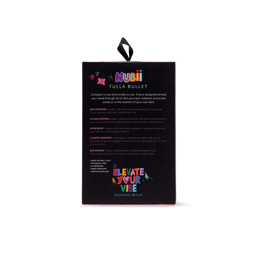 Joining the Nubii collection is Tulla–our rounded bullet with 10 vibrations. Compact and ergonomically designed, Tulla makes for the perfect travel companion. This beginner-friendly bullet will hold your hand through all life’s journeys–whether across the world or in the comfort of your bed. Powered by the Nubii motor, this rechargeable bullet offers unparalleled power and the opportunity to grow alongside the Nu Sensuelle brand.